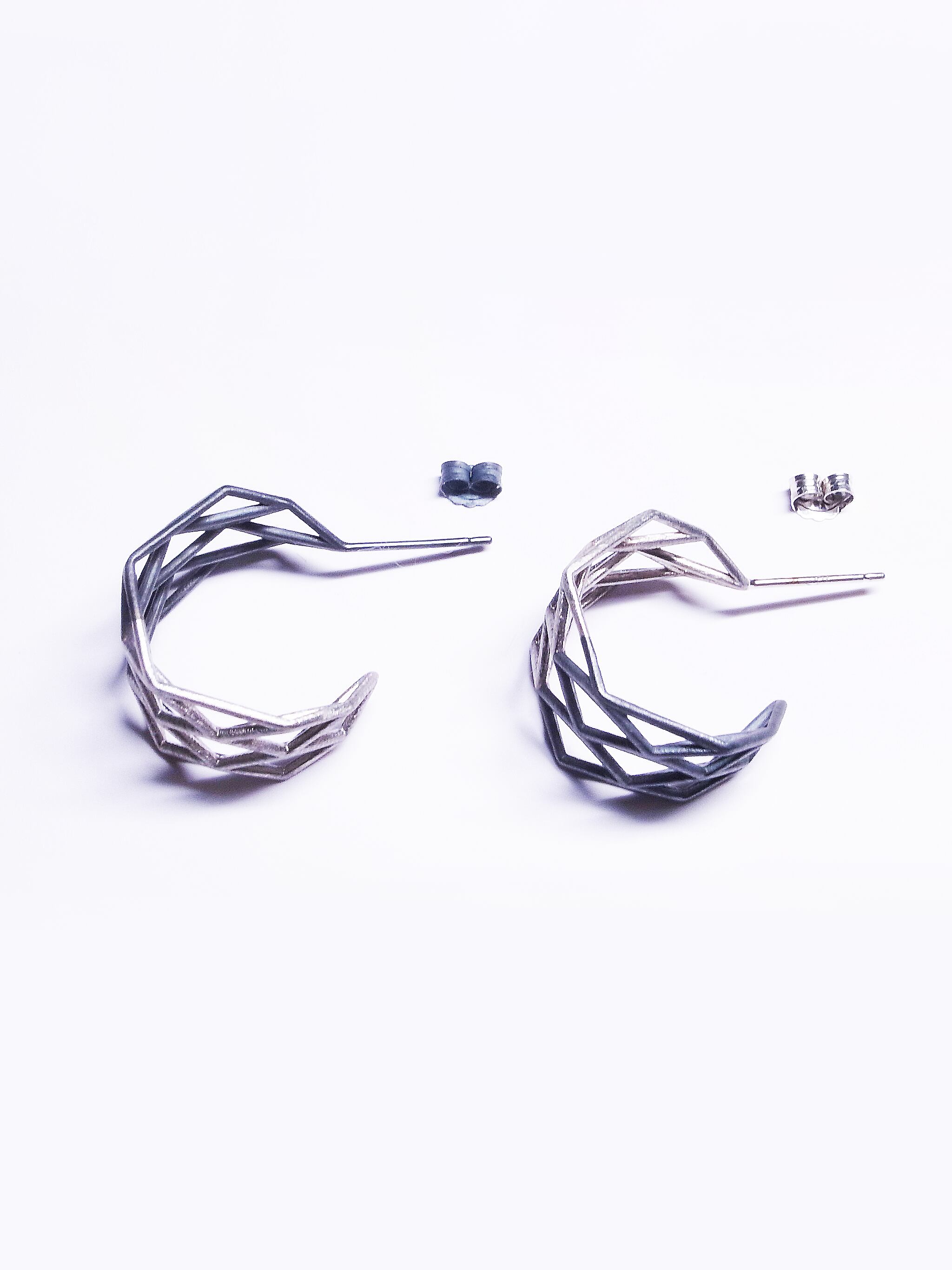 多角形で構成されたピアスは、線と面の表情が惹きたち