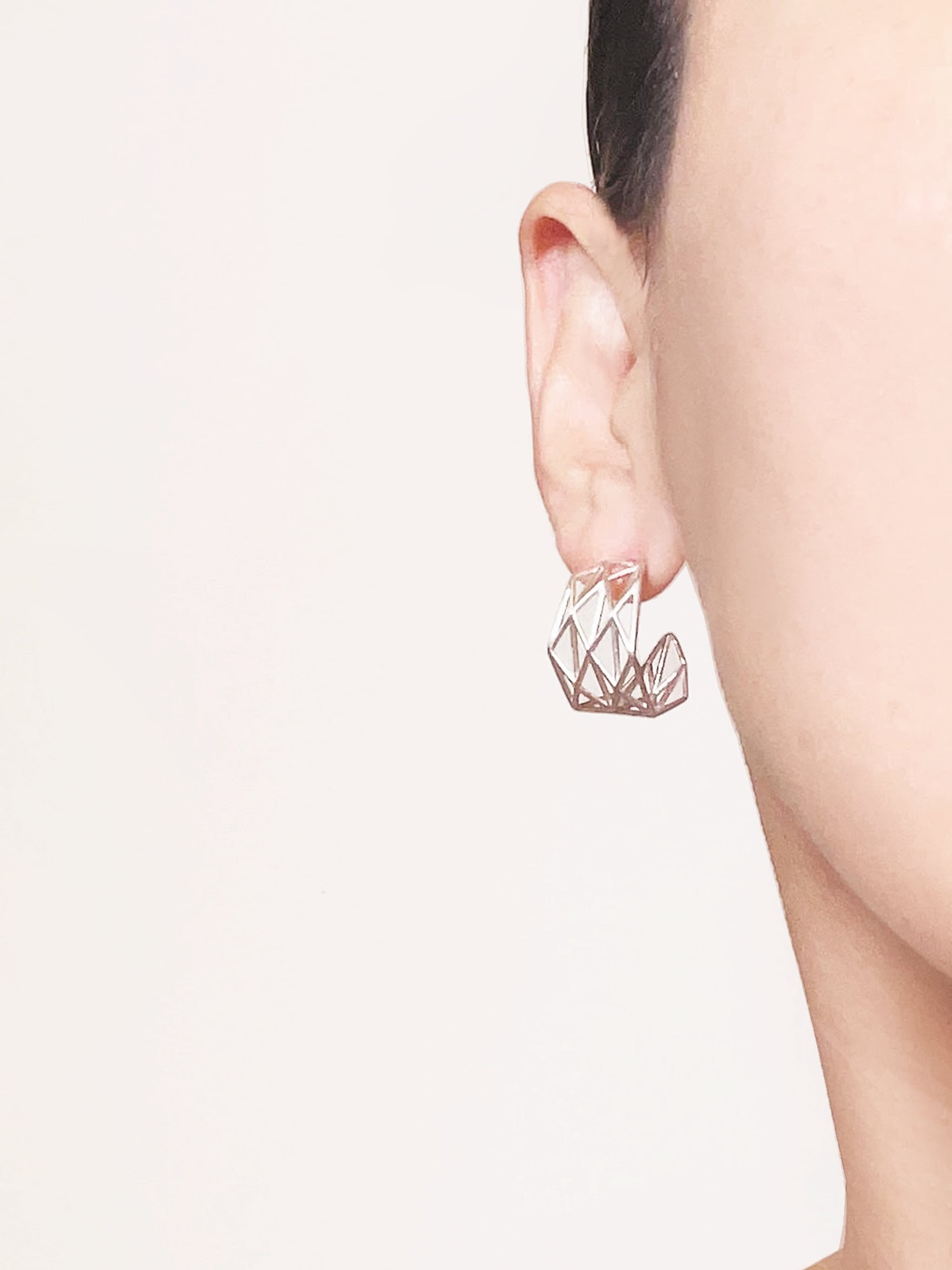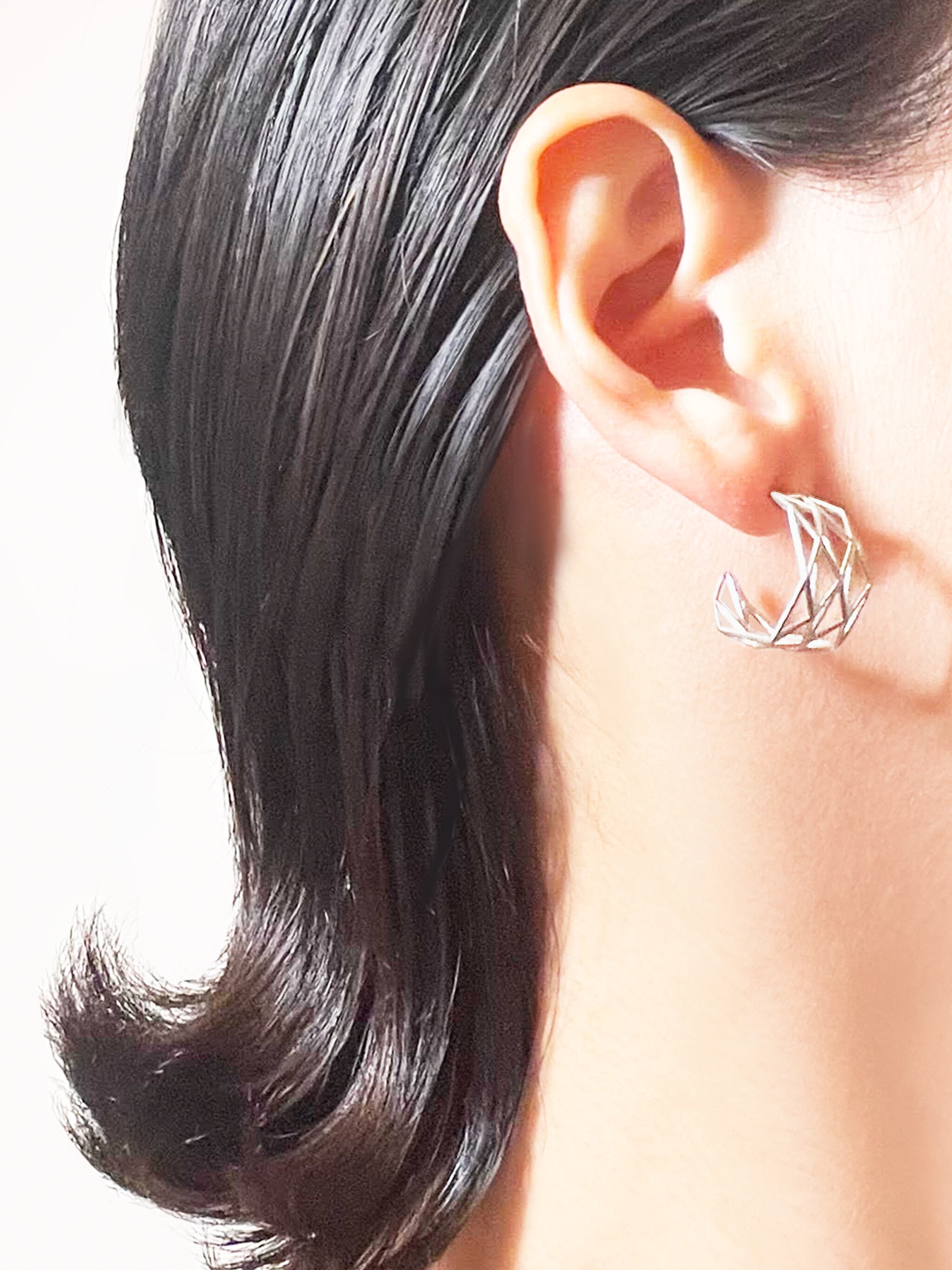 多角形で構成されたピアスは、線と面の表情が惹きたち